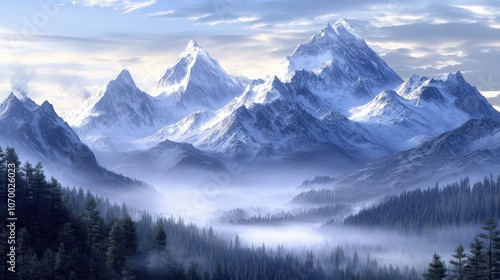 Breathtaking panoramic view of majestic snow-capped mountains surrounded by a misty forest during twilight.
