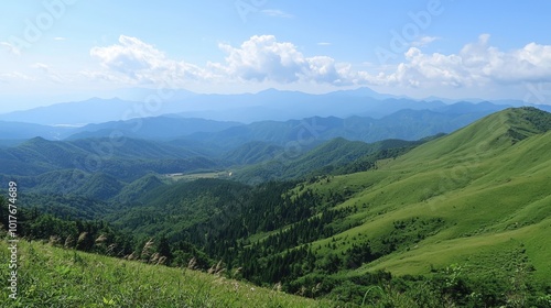 Breathtaking panoramic view of rolling green hills under a bright blue sky in summer