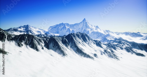 Breathtaking peaks rise majestically, blanketed in white snow under a brilliant blue sky. The landscape showcases towering mountains, glistening in sunlight, evoking awe and serenity.