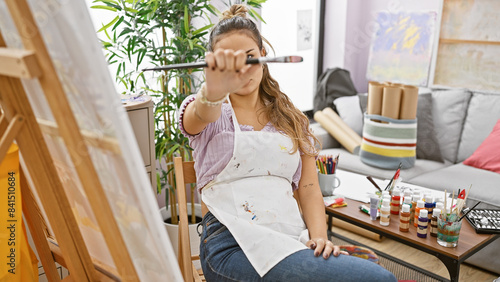 Breathtaking portrait, young, beautiful hispanic woman artist in apron, lost in thought looking at paintbrush in hand, contemplating ideas for her next canvas masterpiece in cozy art studio.