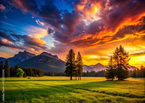 Breathtaking silhouette photography captures a serene grass field and majestic mountain trees, set against a vibrant sunset, highlighting nature's