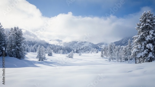 breathtaking snow landscape, serene winter scene with snow-covered trees and mountains, peaceful snowy terrain under a clear sky