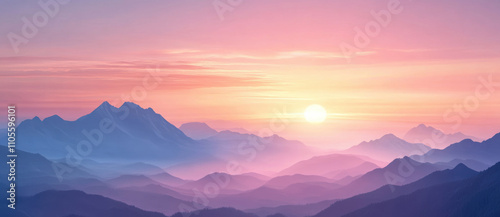 breathtaking sunrise over serene mountain range, with soft pastel colors painting sky and misty layers creating tranquil atmosphere