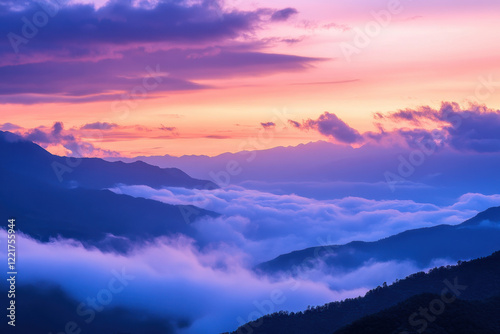 Breathtaking sunset over mountains with vibrant colors and clouds. scene captures serene beauty of nature, showcasing layers of hills and misty valleys