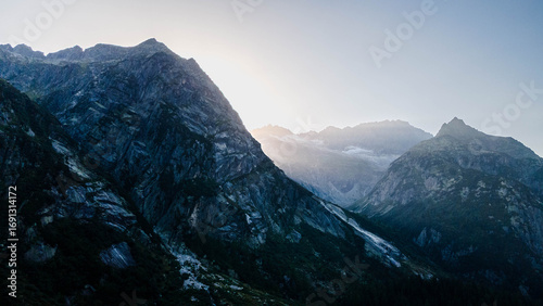 Breathtaking Swiss Alps landscape with mountains and clouds, captured by drone. Atemberaubende Schweizer Alpenlandschaft mit Bergen und Wolken, aufgenommen mit Drohne.