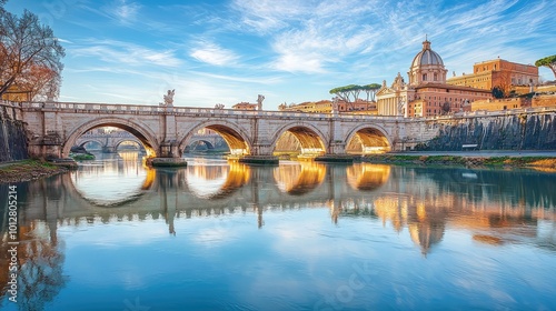 Breathtaking view of a historic bridge reflecting on the serene waters under a vibrant blue sky, highlighting architectural beauty.