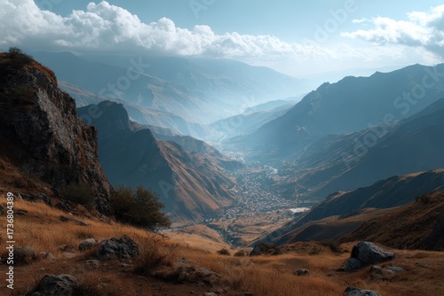 Breathtaking view of Jarlu Valley showcasing Mountain Mother World with dramatic clouds and serene landscape at midday