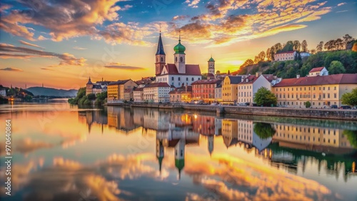 Breathtaking view of Passau, reflected in the Danube River at sunset , Passau, Bavaria, Germany, skyline