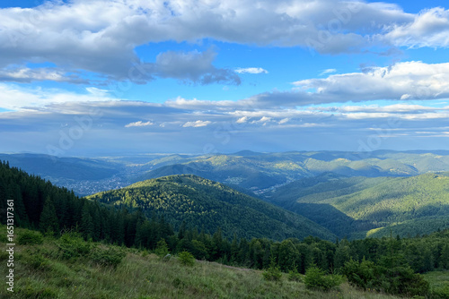 Breathtaking view of valley nestled among rolling hills in Ukraine. Lush forested landscape stretches out to distant town Yaremche, bathed in soft sunlight under serene, cloud-speckled sky.