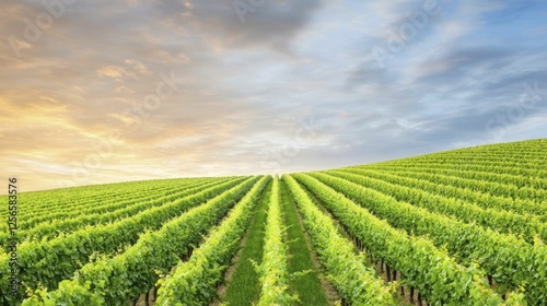 Breathtaking vineyard sunset showcasing rich colors reflecting on rows of grapes, encouraging exploration of peaceful rural beauty.