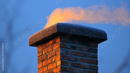 Brick chimney releasing smoke, capped with frost. Blue sky, winter sunrise