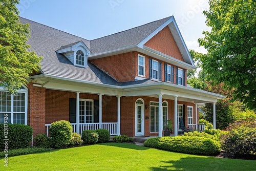 Brick house with white porch, green lawn, and mature trees. Ideal for real estate, home improvement, or insurance websites.