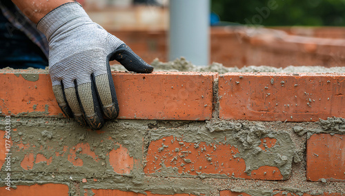 Bricklayer carefully placing a red brick during construction of a new wall