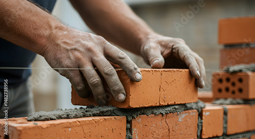 Bricklayer Hands Laying Red Brick on Wall with Mortar in Construction Site