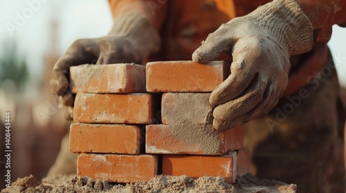 Bricklayer stacking bricks with precision at a residential site. Featuring craftsmanship and stability
