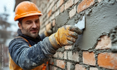 Bricklayer worker installing brick masonry on exterior wall with trowel putty knife, Generative AI