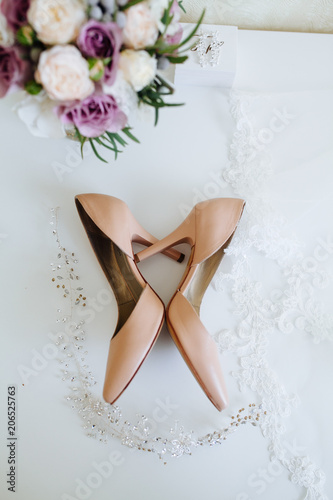 Bridal morning details composition. Top view of wedding leather shoes, beautiful bouquet of violet flowers with ribbons, earrings, garter and bridal veil. Flat lay.