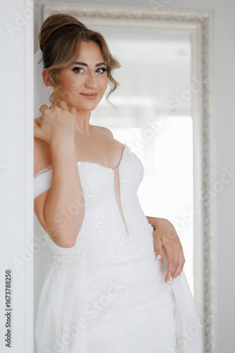 Bridal portrait of a woman in a stunning wedding gown in a bright and elegant setting