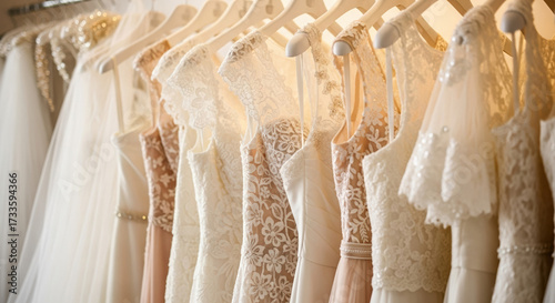 Bridal shop displaying wedding dress options, showcasing elegance and style. Wedding dress choices highlight lace details, exquisite designs and delicate fabrics, inviting brides to find dream attire.