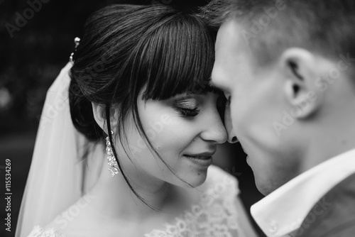 Bride and groom at wedding Day walking Outdoors on summer nature. Bridal couple, Happy Newlywed woman and man embracing. Loving wedding couple outdoor. Black and white