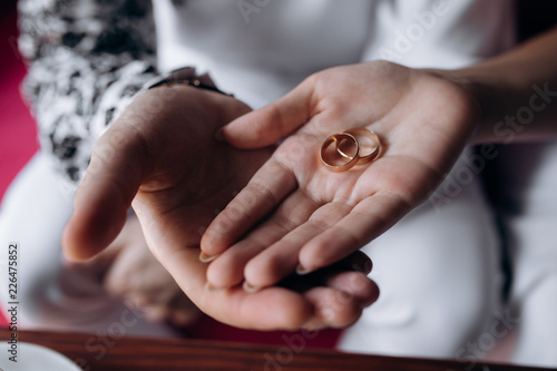 Bride and groom hold golden wedding rings in their arms