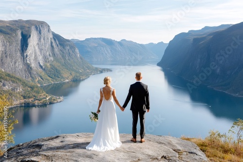 Bride and groom holding hands admiring beautiful norwegian fjord landscape