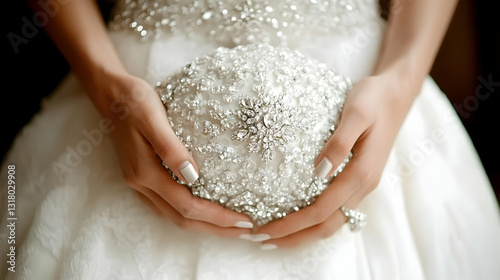 Bride holding bouquet, wedding dress