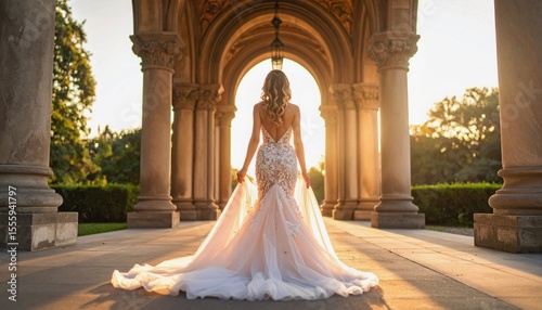 Bride in a mermaid wedding dress at the entrance to a historic site