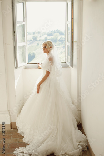 Bride in magnificent long dress poses before the window in white