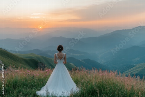 Bride in Wedding Dress on Mountaintop at Sunset