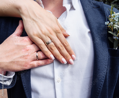 bride's hand with an elegant wedding ring with white gold diamonds on a bouquet of their peonies