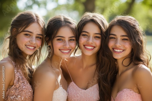 Bridesmaids at a wedding, Four young women smiling and posing. All of them are dressed in dresses and crowned with flower crowns. The scene looks happy and festive.