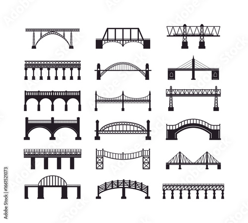 Bridge Diversity in Architectural forms: A black and white architectural illustration showcasing various bridge designs, offering a glimpse into the diverse world of construction.