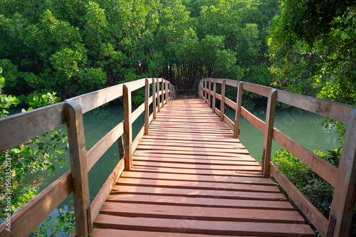 Bridge, mangroves at coast of India, rhizophora mangle red mangrove forest, coastal ecosystem, monsoon and rainforest vegetation, shallow water tree