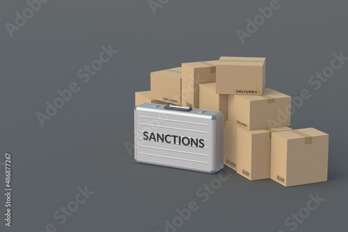 Briefcase with inscription sanctions near box. Prohibition on trade in goods. The concept of international financial sanctions. Restriction on import, export. Worldwide isolation. 3d render