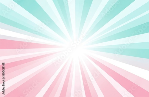 Bright abstract background featuring radial stripes in pink, white, teal. Exploding sunburst pattern with soft glow emanates from center. Clean, vibrant design for graphics, promotions, digital art