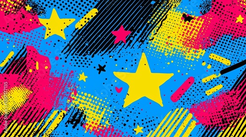 Bright abstract pattern with stars and lines on blue background with pink and yellow elements