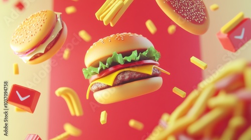 Bright abstractions of burgers, fries, and pizza create a playful atmosphere with vibrant colors and fun shapes in the composition. Generative AI