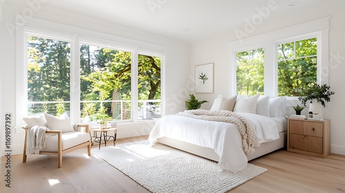 Bright, airy bedroom with large windows, white bedding, light wood floors, and natural light streaming in.