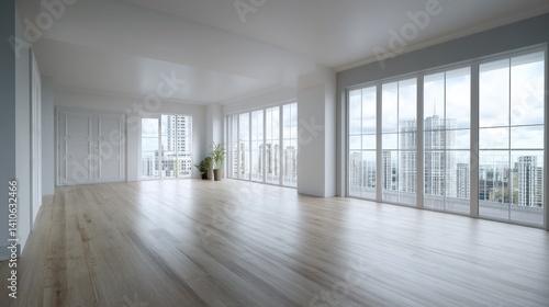 Bright, airy empty apartment with hardwood floors and floor to ceiling windows offering a stunning city view. Perfect for a modern minimalist lifestyle.