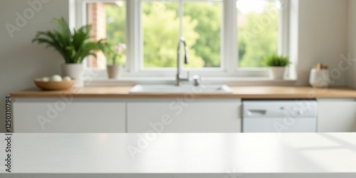 Bright, airy kitchen features a clean, minimalist design with a spacious countertop and natural light streaming through a large window