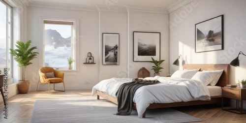 Bright and airy bedroom featuring framed travel photography, bedroom, home