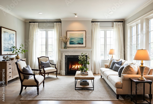 Bright and airy living room interior with fireplace neutral colors hardwood floors and large windows home decor furniture design inspiration comfortable cozy lifestyle elegant upscale aspirational