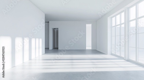 Bright and airy minimalist empty room interior with sunlight streaming through large windows