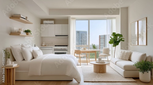 Bright and airy studio apartment featuring minimalist decor with a cozy bed, sofa, and kitchenette overlooking a cityscape.