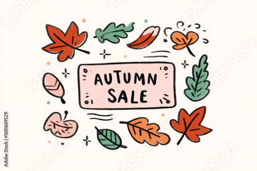 Bright and cheerful autumn sale graphic featuring colorful falling leaves surrounding a central text promoting special offers for the fall season, perfect for marketing campaigns