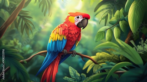 Bright and cheerful cartoon parrot with colorful feathers, perched on a vine in the jungle