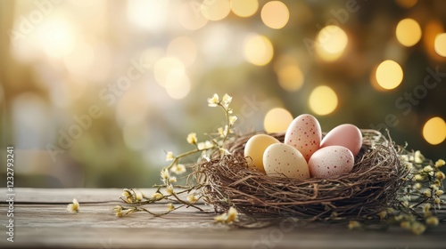 Bright and Cheerful Easter Composition with Natural Elements Featuring Colorful Eggs in Nest on Wooden Table Surrounded by Spring Blooms and Bokeh Background