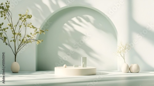 Bright and contemporary 3D studio environment with empty floor and wall sunlit product display podium and shadow overlay from window lighting casting on tabletop