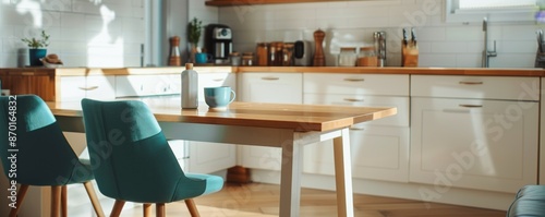 Bright and cozy white kitchen with wooden dining table and modern decor